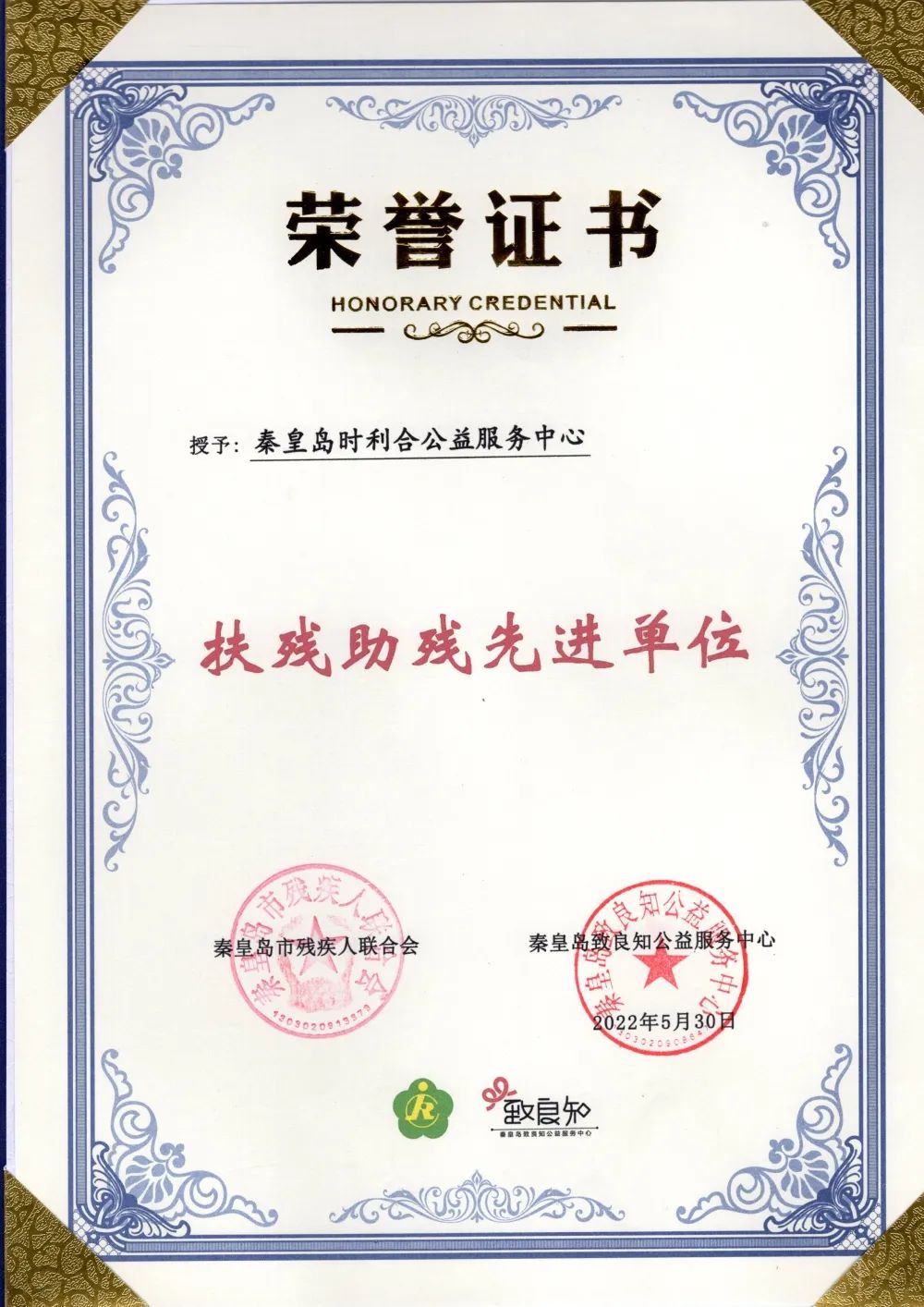 為了更系統(tǒng)、更完善的服務(wù)殘疾人、救助弱勢(shì)群體及困難人群,做好社會(huì)援助,也為了帶動(dòng)更多的員工、客戶(hù)及員工家屬一起做公益,承擔(dān)社會(huì)責(zé)任,為社會(huì)的和諧發(fā)展添磚加瓦,我們于2021年7月成立了時(shí)利合公益服務(wù)中心。并于2022年5月榮獲秦皇島市殘疾人聯(lián)合會(huì)頒發(fā)的“扶殘助殘先進(jìn)單位”稱(chēng)號(hào)。